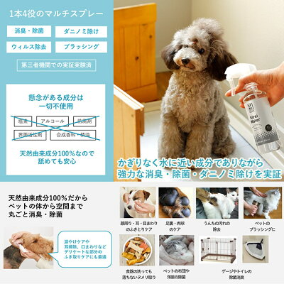 99.9%強力除菌 水から生まれた消臭除菌スプレー! ペットのケージ、ベッド、カーペット、車の中など、臭いや汚れが気になる箇所にお使いください。